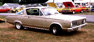 GoldFish Set-Up Notes by Season My Barracuda was originally purchased with the idea that it would be my daily driver. However, various old car problems and the dawning realization that parts were MUCH harder to come by for the fish than for the Mustang soon moved it to back-up car status. When the rear axle wore out the summer after I became a father and a graduate student (Yea, I committed the tactical blunder of doing both at the same time in Spring of '95), it went up on jack stands (were it remained until 06/03/2001), awaiting my attention and a portion of my COPIOUS spare time. While my Barracuda has only about 68,000 miles on the clock, the previous owners were none too kind to it. The original owner purchased the Citrine Gold Metallic Formula S with a black interior, console, disk brakes, and a 904 automatic transmission in New York. The Following year he retired to Arizona (and, apparently, quit changing the GoldFish's oil). When he passed away the GoldFish emigrated to Michigan where its 2nd owner had it repo'd (more than likely more poor maintenance here). Its third owner purchased it off of the impound lot (and the GoldFish finally got lucky). Pete McNicholl, the GoldFish's third owner, is a retired Chrysler Engineer who enjoys restoring, showing, and occasionally racing early A bodies and '50s Hemi cars. While he did not restore the GoldFish, he did treat it kindly, showing it in unrestored/driven condition around Michigan and driving it on a regular basis. I purchased the GoldFish in 1990 with 58,000 miles on it for the sum of $4500.00 and my trusty 318 powered '74 Dart (a converted, rusty, \6 car). That's when things started to get interesting... When the GoldFish first arrived in the driveway at my mom's house, its greeting to me was to spit a core plug out of the back of the driver's side cylinder head right there in the driveway (I bet you can see where this is going). I ended up pulling both heads off, getting a valve job, a mild port clean up, converting to a hydraulic cam (remember this was to be a daily driver), replaced one cam bearing, and the oil pump and pickup. Once I had it running again and through Maryland's title transfer/licensing inspection (very picky) I started to drive the GoldFish on a daily basis and found that it tended to run hot; after replacing the water pump, thermostat, and radiator the GoldFish's temp stabilized. How did it run and drive? Once I replaced the ball joints, tie rod ends, and shocks, very nicely, thank you. The Formula S package makes for a well balanced car that compares well with modern sport coups in every category except emissions and gas mileage. Other minor upgrades include a K&N air filter (I use these on all my vehicles), urethane bushings for the sway bar (this swap was a bit of a pain but worth the effort), and a set of P 205 60HR 14 Yokohama A509s (a nice inexpensive H rated tire that works well on dry or wet pavement). At the strip the tired 273 Commando (it uses a quart of oil every 100 miles) has pushed the GoldFish to a best run of 17.20 @ 84 MPH despite the undersized replacement exhaust system. On the street the GoldFish could defend its honor against the more common Cameros and Mustangs. As mentioned above the GoldFish became a backup car due to the difficulty in getting parts. I still drove to work once or twice a week in good weather, although I will drive it in the rain on occasion by choice (unlike the Rust-er-Mustang which leaks and gets down right scary on wet pavement (all that torque =8^D)). Unfortunately for the GoldFish (as I mentioned above) it decided to use up the rear wheel bearings during the summer of 1995. Normally this wouldn't have been a problem, but I'd just started Grad' School AND become a father during the spring. I managed to get the axle out of the car, got it rebuilt, and back to the garage floor under the car but there it sat from August 1995 to about late May of 2001. And then... Great news! The GoldFish swims again. Got it down off of jackstands for the first time in almost six (6!) years on Sunday June 3rd, took it to its first Autocross on June 24th! In the time since I parked the GoldFish, I got my Mustang (Ol'Beastly) back on the road (I grenaded its 289 in 1991), started autocrossing it in C Prepared. This has changed the plan for the GoldFish (I've got the racing bug BAD). So... I'm developing the GoldFish as a test mule for my '66 Dodge Dart to go Vintage Road Racing. I'm using the local autocrosses to develop the handling on the car and don't expect to actually be running the Dart in Fender-to-Fender events for another two or three years. The eventual focus of the GoldFish's Development will be as a competent grand touring car with track day potential. While mosifications so far have stuck mostly to the letter and/or spirit of vintage racing rules (specifically SVRA/HSR), (distant) future plans include the installation of Edlebrock heads and DFI, which should net close to 400 WRHP, the re-installation of the heater, and steel front bumper. Below are links to pages covering the set-up notes and results by event for each of the seasons I've run the GoldFish in: NOTES: Links to Official Results Pages Oil Control One issue that's come up at every event, except the rainy fourth one, has been oil starvation. After every run I've come back to the pits with the lifters ticking like I'd run out of oil. I've worked out a solution with a guy named Armando Z. Rodriguez of: Armando's RACING OIL PANS, ARMANDO'S WORK (ROUND ONE) AFTER TRIMMING AND INSTALLATION (ROUND TWO) This also shows the new swaybar This oil pan was installed before the GoldFish's eighth autocross and made noticeable difference in the oil supply to the engine, as I no longer heard the click-i-ty-clack of deflated hydraulic lifters after every run. Was it a complete cure? No (see commentary following autocross 17, above). It does help though, Its just that there isn't room for really big kickouts on the sides of the oil p