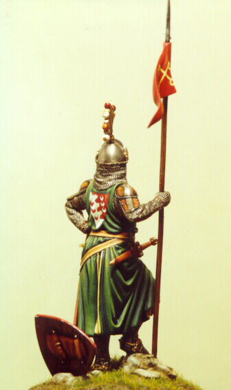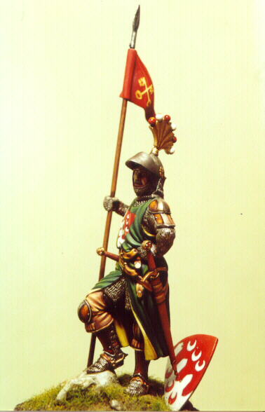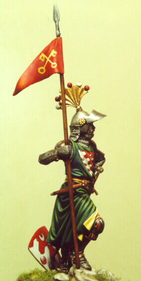 Ovviamente è il classico soldatino ideale che ogni soldatinaio ha in mente (spesso solo lui). Quello che lo metta in condizione di raccontare tutto il suo sapere al malcapitato di turno che quella sera, in attesa che venga servita la cena, degustando l’aperitivo davanti alla vetrina, farà la domanda sbagliata. (si potrebbe dire che siccome quello non è mai arrivato, oggi tocca a Voi, miei quattro-lettori-quattro). Quello che non ho ancora detto, ma che sarà decisivo nella selezione, è che tale soggetto deve essere inseribile in una vetrina dedicata alle famiglie romane del Primo Giubileo del 1300, in occasione della Mostra del Soldatino da Collezione che si terrà a Roma, nel 2000.