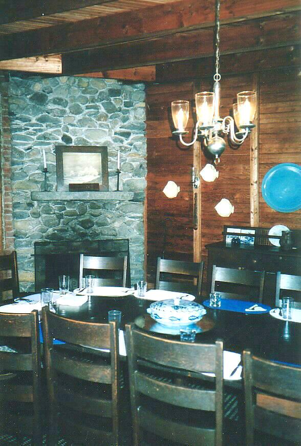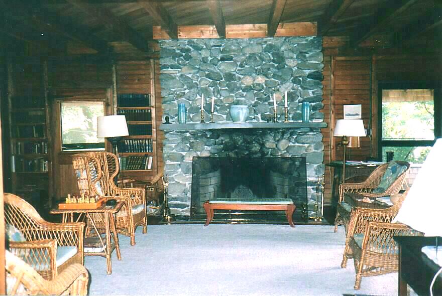 Inside Riven Rock Constructed almost entirely of wood, stone and brick, Riven Rock has a quiet and quaint warmth that invites relaxation. Below are views of a typical bedroom; the family room, which spans the house from front to rear, providing views in three directions; and the dining room, which overlooks the bay and has an oval table that comfortably seats up to twelve people. A drop-leaf table next to the windows can seat an additional four people when necessary.